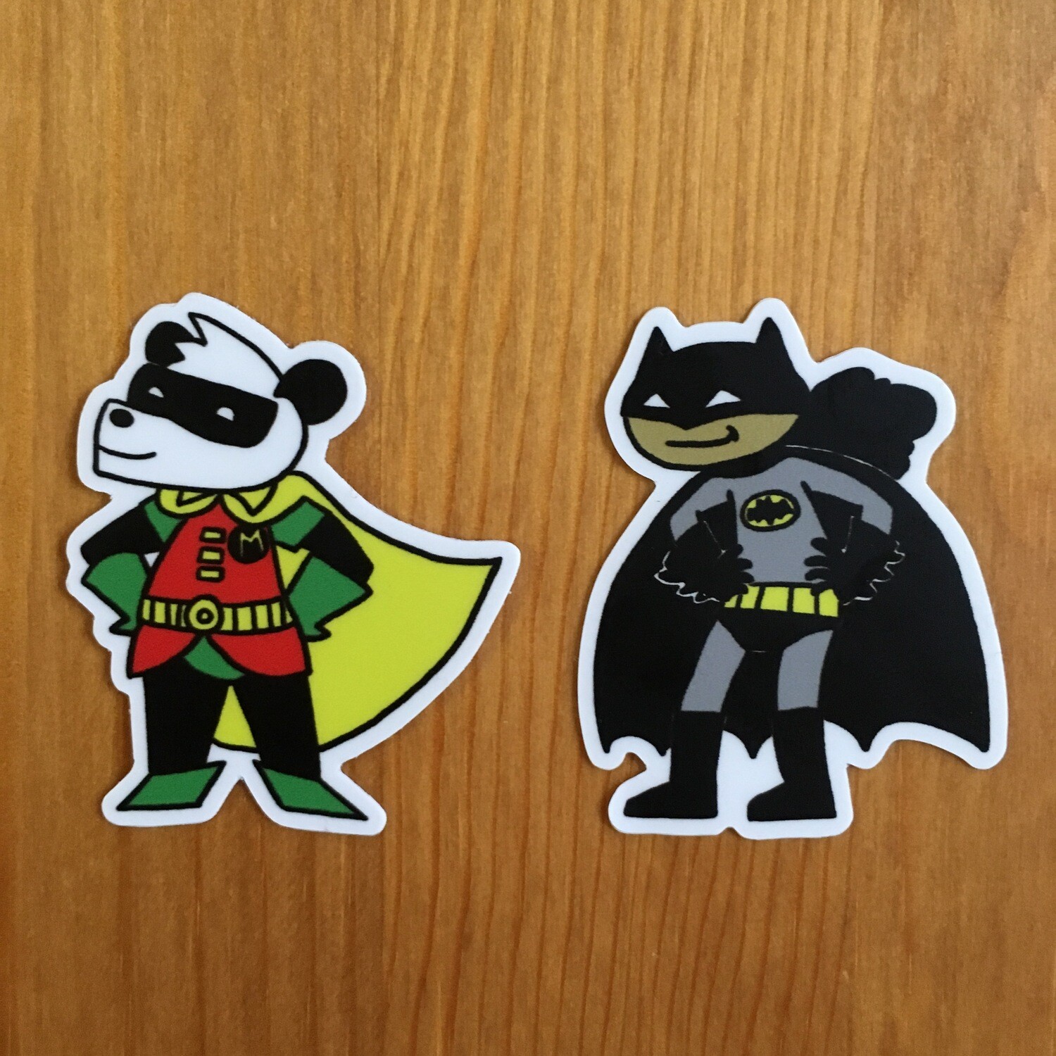 Two stickers featuring the characters from my comic Mito and Me dressed as B@tman and Robin. Each sticker is thick, durable vinyl and 2 inches tall.