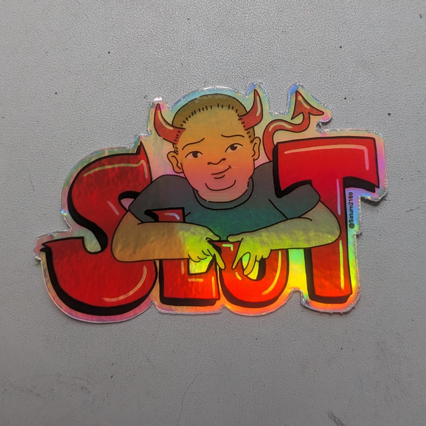 3 in Iridescent sticker featuring Bobby Hill as a little devil.