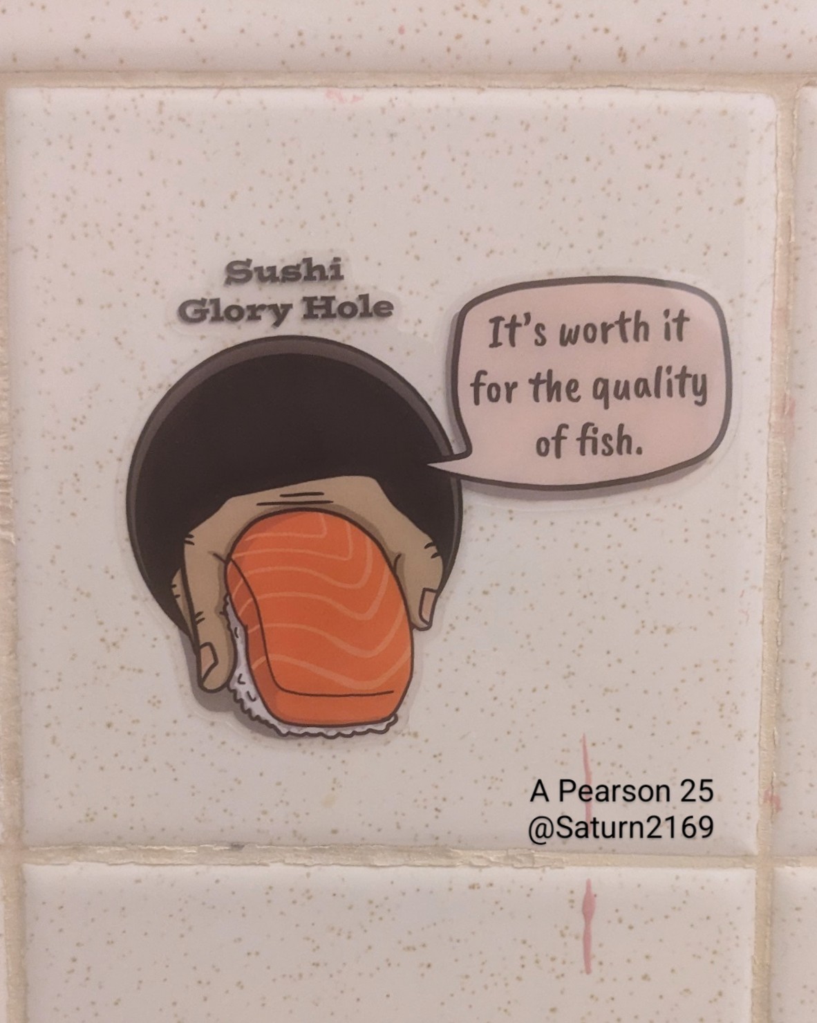 Sushi Glory Hole sticker with the quote "It's worth it for the quality of fish." Based on the Lonely Island song and SNL sketch Sushi Glory Hole.